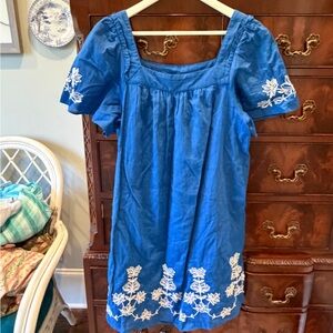 Bright blue shift dress with white floral embroidery along the hem and sleeves. Lightweight fabric and relaxed fit. Simple, feminine silhouette perfect for daytime wear and July 4th