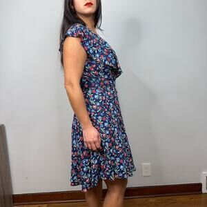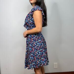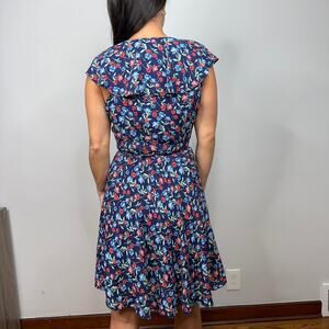 Draper James Blue Floral Ruffle A-Line Wrap Dress. Excellent gently used condition. Lined. Adjustable due to wrap feature. V-neck. Ruffle cap sleeves.