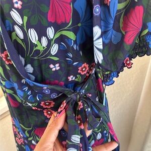 This charming sundress by Draper James features a vibrant blue and red floral pattern, perfect for a wedding guest or casual outing. The asymmetrical wrap design is complemented by a flattering V-neckline and playful puff sleeves, offering a stylish and comfortable fit.