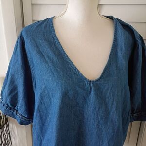 Draper James Denim V-Neck Puff Short Sleeve Cotton Blouse XXL