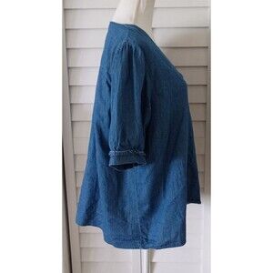The Draper James Denim V-Neck Puff Short Sleeve Top in XXL is a classic and preppy blouse made from 100% cotton denim fabric. This pullover top features a solid blue color with a V-neckline and puff sleeves, making it a versatile and stylish addition to any woman's wardrobe. Perfect for the summer, fall, and spring seasons, this top offers a regular fit and is easy to care for with its machine washable design. Perfect for pairing with jeans or trousers, this top embodies a timeless and stylish look. EUC no known defects.