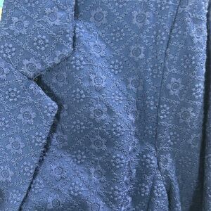 Blue eyelet blazer with single gold button closure. Faux front welt pockets. Back vent is still closed. 100% cotton material. Size small. Non smoking home.