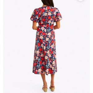 Charming floral midi dress by Draper James. Features vibrant blue and red floral pattern. Short puff sleeves. Perfect for any occasion. Worn only once.