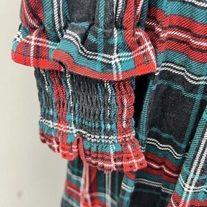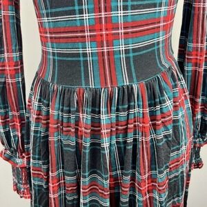 -Georgia plaid pattern dress with small puff sleeves and pleated skirt. Sleeves have elastic cuffs.