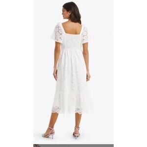 New with tags Draper James Deana Dress in Magnolia White, size small. Romantic midi silhouette with an allover lace overlay, square neckline, flutter sleeves, and a smocked back for a comfortable, flattering fit. Timeless and feminine—ideal for graduations, bridal showers, engagement photos, garden parties, or a European summer vacation. Style with espadrilles or heels for July 4th, Labor Day, or any warm-weather event.