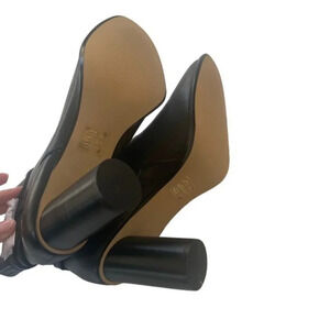 They're simple and classic, made from LWG-certified sustainable leather, with details that make a subtle statement: an almond toe, stacked 3.5 inch heel, staggered edge topline and wraparound ankle strap.