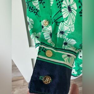 Draper James Long Sleeve Silk Dress Green Navy Size 0 Gold Accents