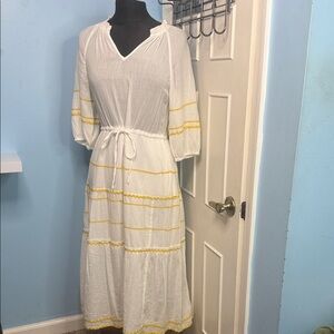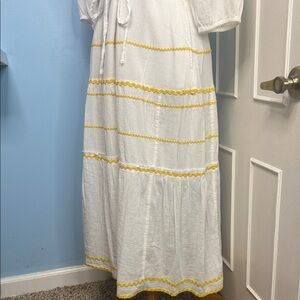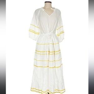 Draper James Martina Popover Ric Rac Peasant Midi Gauze Dress Large Elegant white midi dress with yellow accents. Features a tie waist and flowing sleeves. Perfect for casual outings. Cotton Machine Wash Cold