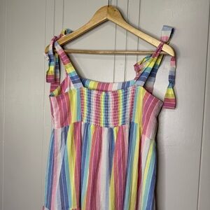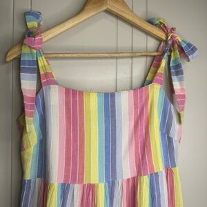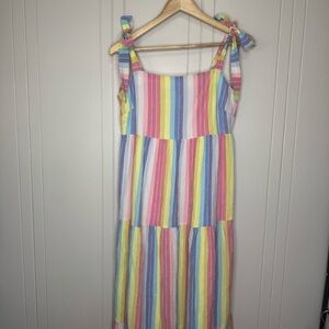 Vibrant Draper James maxi dress with colorful stripes. Features tie straps. Perfect for summer. adjustable bow tie as straps.