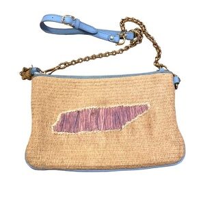 Excellent preloved condition, clean interior, 22” strap drop, faux blue leather details, gold chain hardware