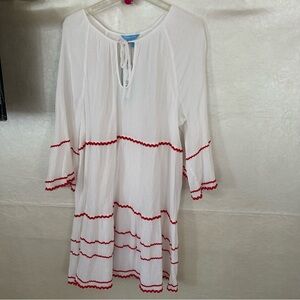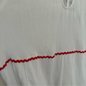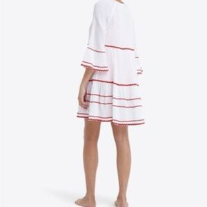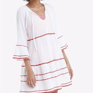 Experience effortless style with the Draper James swim coverup, crafted in a breezy white fabric with striking red trim. Its flowy silhouette features tiered ruffles and three-quarter bell sleeves, perfect for a chic beachside look. The V-neck design adds a touch of elegance, making it a must-have for your next seaside escape.
