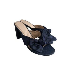 Elegant navy heeled sandals with bow detail. Perfect for any occasion.