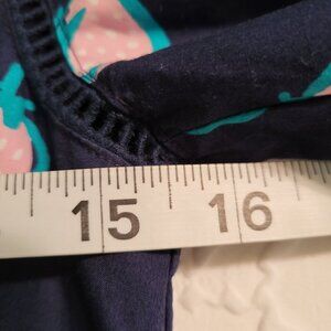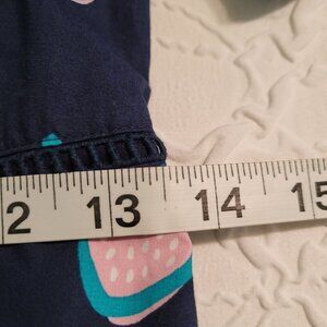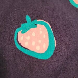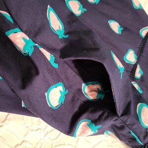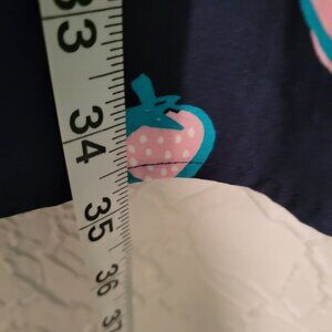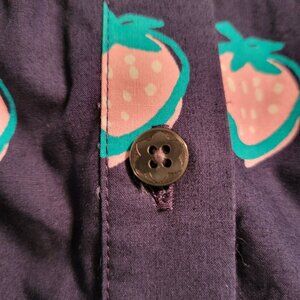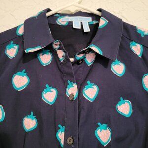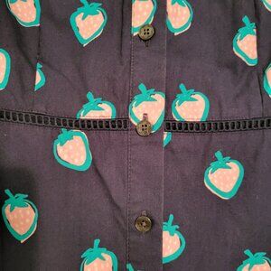 Charming navy midi dress with playful strawberry print. Short sleeves and button-down front. Perfect for casual outings.