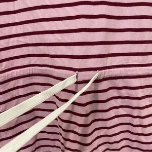 Chic pink striped midi dress. Features short sleeves and drawstring waist. Button detail on shoulder. Perfect for casual outings.