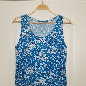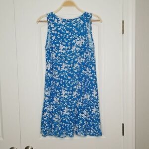 Lovely floral printed sleeveless swing dress. Stretchy ponte knit has a soft buttery feel. Scoop neckline. Ruffle hem.