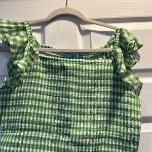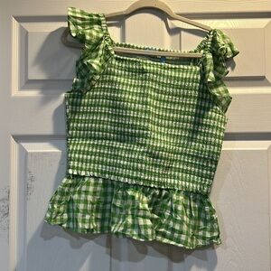 Gently worn Draper James Green Gingham Smocked Top women’s size L. Green and white gingham, smocked top, ruffled sleeves with elastic around neckline, bottom peplum ruffle at hem. Perfect for St. Patty’s Day! Offers accepted!
