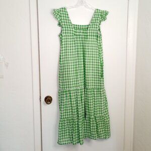 Draper James RSVP Green & White Gingham Tiered Sundress, square neckline, flutter sleeves, tiered skirt, lined, with side pockets, midi length. Pretty spring & summer dress with country charm! Cottagecore, farmhouse, prairie, coastal cowgirl, boho vibe.