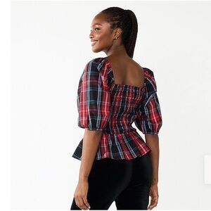 Draper James RSVP New Size L Smocked Peplum Top Elbow Sleeve Red Multi Plaid