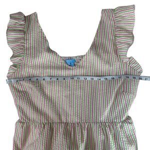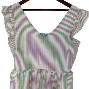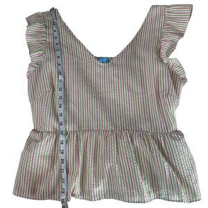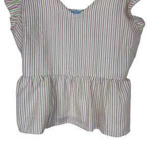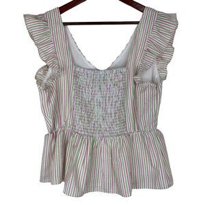 Draper James rsvp white, green and pink pinstripe blouse. Smocking in back, elastic waist in back. Peplum waist