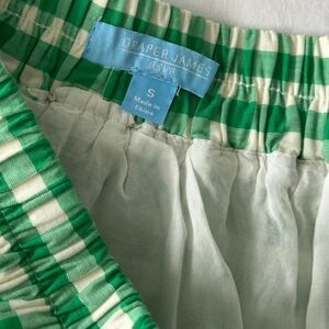 Draper James RSVP tiered A-line skirt in a classic green gingham print. Women’s size small. Features a flattering high-rise waist, tiered silhouette, and lightweight fabric for easy wear.