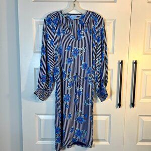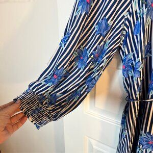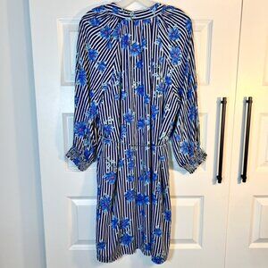 Draper James RSVP V-Neck Smocked Sleeve Dress Blue Floral Stripe Size L NWT