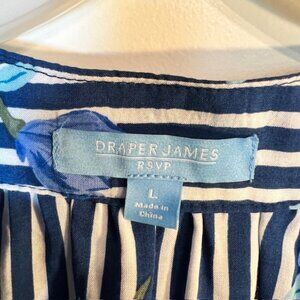 Elevate your wardrobe with this stunning Draper James RSVP V-Neck Smocked Sleeve Dress in size Large. This brand-new-with-tags (NWT) dress features a beautiful blue floral print over classic navy and white vertical stripes for a fresh, feminine look. The smocked long sleeves add a trendy and comfortable touch, while the v-neckline flatters the silhouette. Made from 100% rayon shell and lining, it's lightweight, flowy, and perfect for spring and summer events, garden parties, brunches, or vacation getaways.