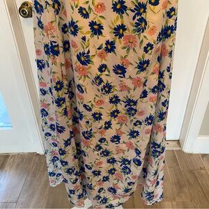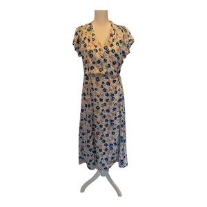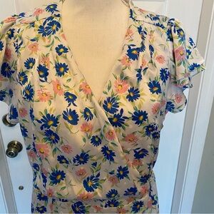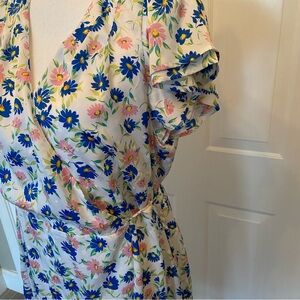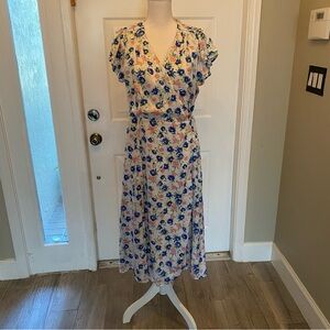 Draper James RSVP true wrap midi dress with floral print. Flutter sleeves. Flutter sleeves. Fully lined. 100% polyester. Approximate measurements laying flat chest pit to pit 18 inches, length shoulder to hem 47 inches.
