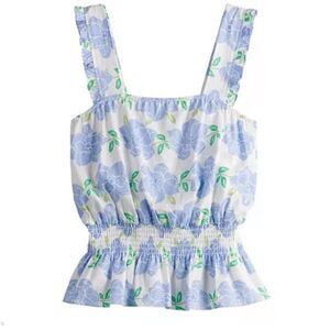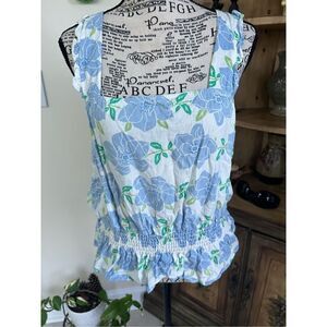 Draper James RSVP sleeveless with ruffle strap floral smock waist with elastic stretch. Peplum rayon linen blend top. Flat front chest, stretch back.