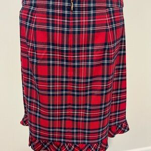 Chic red plaid skirt with playful ruffle hem. Perfect for casual or office wear.