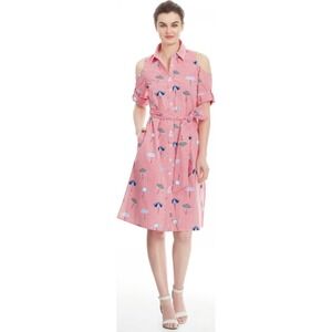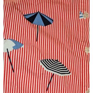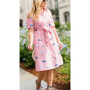 A charming Draper James shirt dress featuring a playful umbrella print. This stylish dress boasts a red and white striped pattern, adding a touch of nautical flair. The cold shoulder design offers a modern twist, while the included belt cinches at the waist for a flattering silhouette. Complete with a button-down front and a classic collar, this dress is both comfortable and chic. Perfect for a summer brunch, a casual day out, or a beach-themed party.