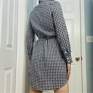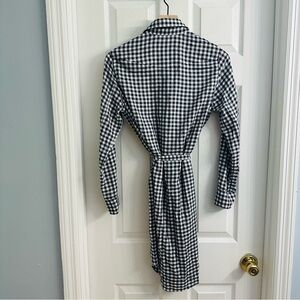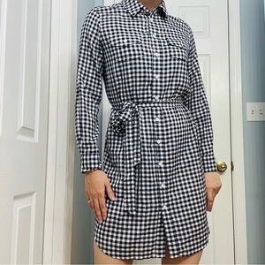 Style: Mini shirt dress. Collared, button up tie waist style. Long sleeves. Navy blue and white gingham pattern. Preppy, casual, classic, minimalist styles.