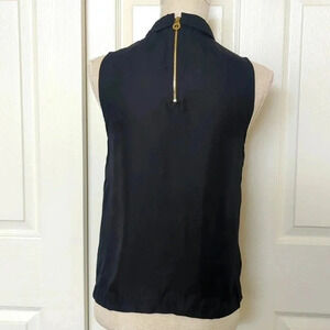 Draper James Silk Bow Beaded Top. Black sleeveless top with white beaded bow details. Zipper at back of neck.