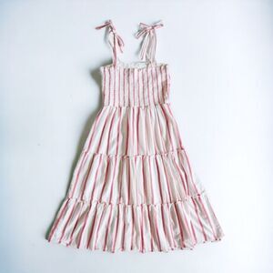 This striped midi dress knows how to turn heads. With tie-shoulder straps, a curve-loving smocked bodice, and a swishy tiered skirt, it’s made for making an entrance—whether you're hitting a rooftop brunch, dancing barefoot at a backyard wedding, or strutting through the farmers market like it’s Paris Fashion Week. It’s polished, playful, and ridiculously easy to wear. Just add attitude.