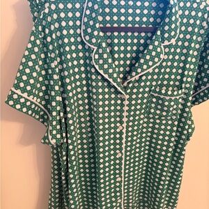 Charming green and white pajama set. Button-up top with short sleeves and Capri bottoms. Incredibly soft. Ideal for relaxing evenings.