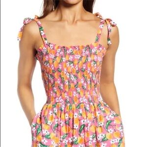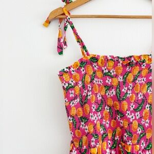 Draper James Taylor Blossom Smocked Orange Printed Midi Dress. Pullover style. Adjustable straps. Smocked on chest. Midi length.