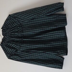 Chic teal checkered blouse with ruffle detail. Ideal for casual or work settings.