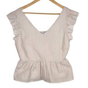 Draper James Top Flutter Ruffle Sleeve Peplum Pink Green White Stripe L