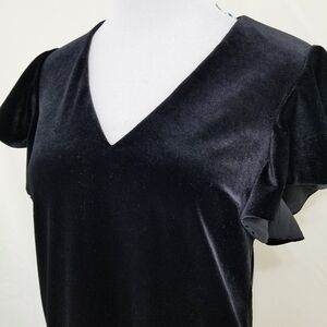 Draper James Velvet flutter sleeve blouse in black. Velvet is everything, y'all! This simple, chic black top is beautiful whether you dress it up or down. Ruffle sleeves give it that feminine touch, while the black velvet makes it feel just a touch dangerous. (Just a touch!). Short sleeves. V-neck collar. Keyhole back with gold button detail. Size 0.