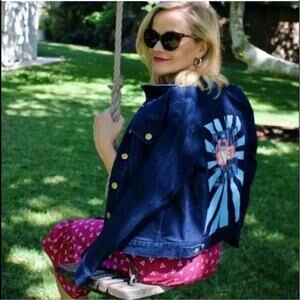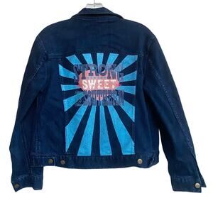 Button Front Trucker/ Basic Jean Jacket in medium wash. Very chic yet classy and hip. Special edition jacket, limited item graphic on the back says strong sweet & southern. Graphic has blue and orange. No stains or holes. Jacket has been washed per instructions. Jacket has some stretch. Please see all photos for condition.