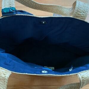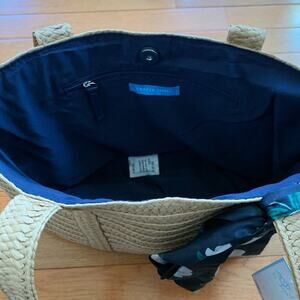 Vacation in a bag: a woven top-handle tote, embellished with a navy silky scarf in the signature Draper James magnolia print. It’s the perfect warm-weather accessory for beach days or spring and summer brunches. Brand new with tags.