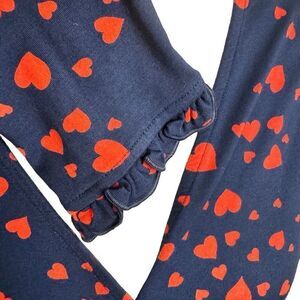 Navy blue faux wrap dress with red hearts. Long sleeves with ruffle lettuce hem. Jersey material. Stretchy. Midi length. Perfect for Valentine’s Day.