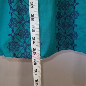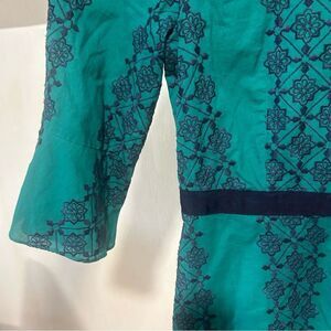 100% cotton Features: * Color: Emerald * Material: 100% cotton * Embroidered with fresh floral stripes * Button front closure with hook at waist * Half length flutter sleeves * Belt like waist * Collar