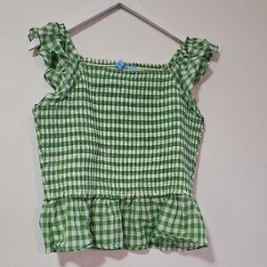Charming gingham top with ruffle sleeves. Features a peplum hem. Perfect for casual outings.