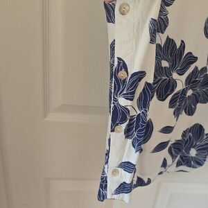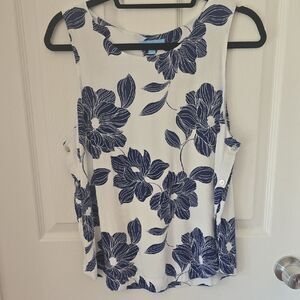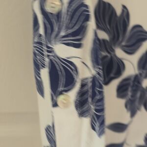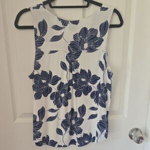 Refresh your style with this elegant sleeveless tank top featuring a striking navy floral pattern and adorned with function mother of pearl buttons on the sides. Perfect for any casual or semi-formal occasion. This top is super cute and can be dressed up or down. It is also lined.
