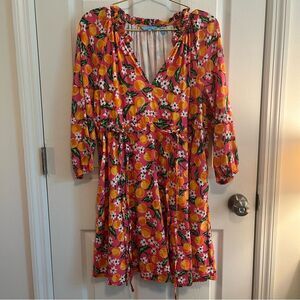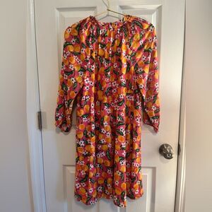 Vibrant floral dress with pink and orange hues. Features a flattering fit and playful design. Perfect for any occasion.