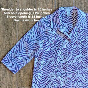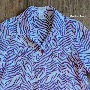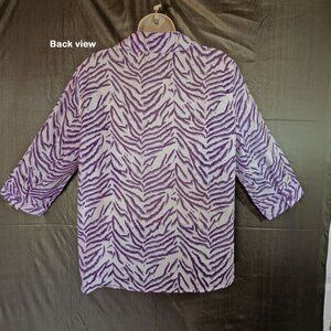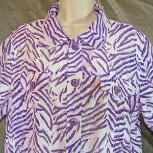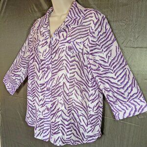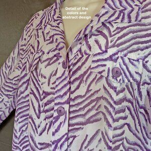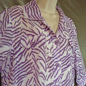 In shades of purple and white, wear this lightweight button front tunic length Drapers & Damon's top as either a blouse or cover up over a tank top or basic dress. Imagine how spectacular this could look with your leggings too. It features a classic collar, 2 front top decorative flaps that button and 3/4 length sleeves with button cuffs. The washable fabric is a mix of 57% Polyester, 40% Rayon and 3% Linen.