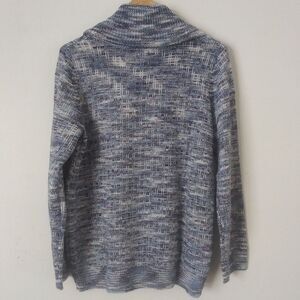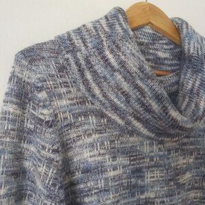 Draper's and Damon's women's cowl neck sweater. Ribbed cuffs and hem, lightweight textured weave in shades of blue and white with a few silver metallic threads. Acrylic/cotton/poly/metallic blend, machine washable, lay flat to dry. Tag size large, measures 21" pit to pit and 26" long. Good used condition.