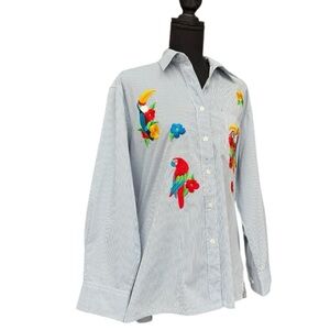 Draper’s & Damon’s, embroidered shirt, parrot shirt, tropical fashion, vintage button-up, bird appliqué, retro style, statement blouse, whimsical fashion, striped button-down, cottagecore, grandmacore, 80s fashion, coastal chic, bohemian fashion, festival outfit, kitschy fashion, tropical vacation, unique vintage, bold style, pinstripe, bird, miami, tropical