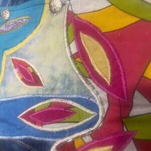 Vivid and stylish embroidered jacket with floral patterns, button closures, and a blend of cotton and polyester for comfort and durability. Artsy, Colorful, long sleeves, business casual, party, Blazer