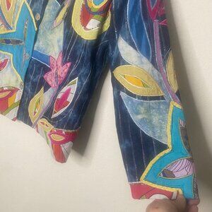 Vivid and stylish embroidered jacket with floral patterns, button closures, and a blend of cotton and polyester for comfort and durability. Artsy, Colorful, long sleeves, business casual, party, Blazer